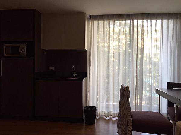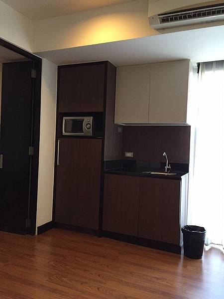 Lily Residence 客廳有流理臺、微波爐,微波爐下面的櫃子打開是小冰箱。流理臺上面的櫃子打開是飯店提供碗盤餐具跟茶杯。