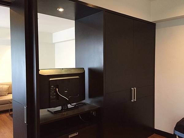 電視右邊是大大的衣櫥,左邊則是分開兩區的門 (目前是打開的)