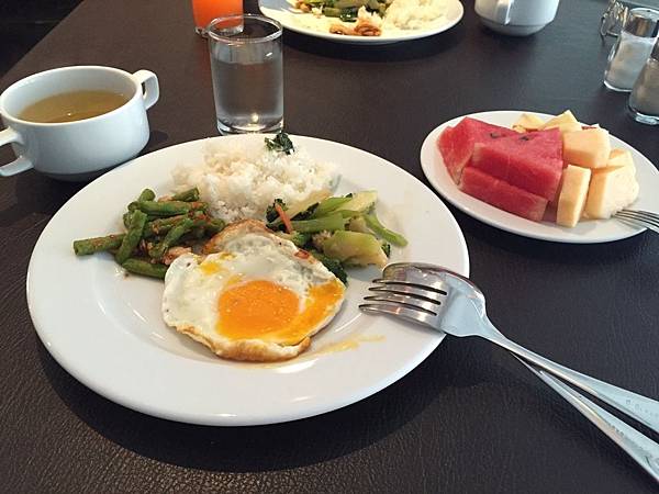 Lily Residence 早餐主要分成東西式,一邊是白飯配青菜,一邊則是吐司沙拉配火腿熱狗。