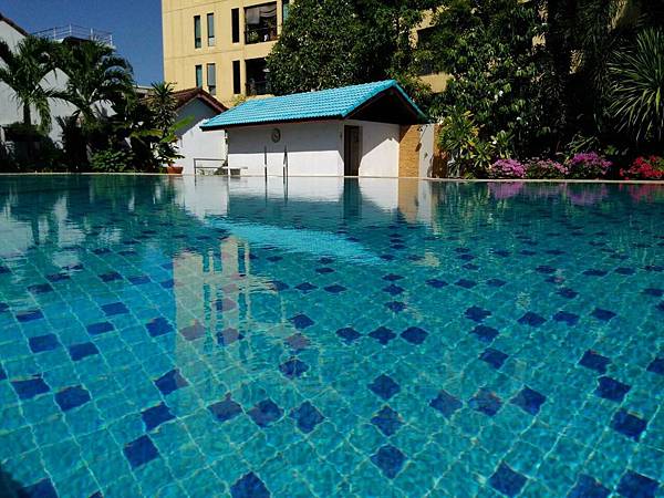 Lily Residence 的游泳池不在飯店內,要從飯店旁邊的一個小巷子走進去。遊泳池蠻大的而且定期在打掃,我覺得很乾淨,想要做個日光浴真的蠻適合的,不過應該會曬傷,因為太陽真的是太大了。