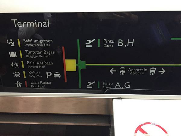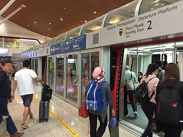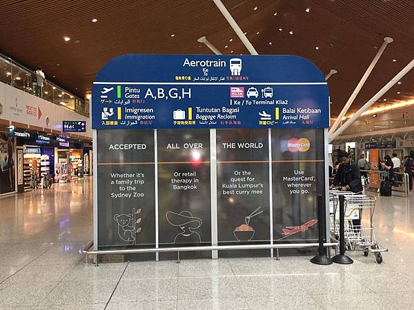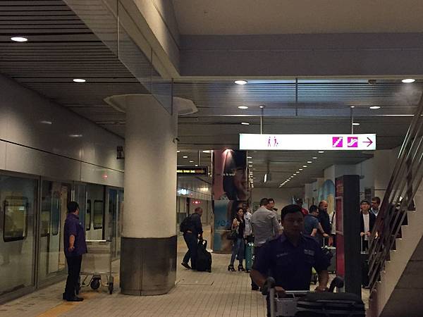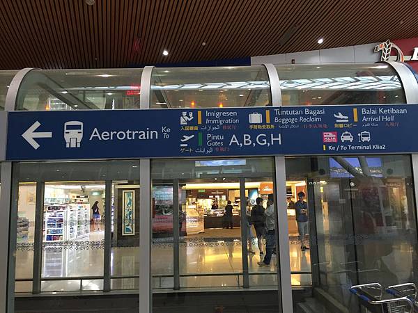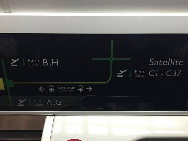 吉隆坡機場有三個大樓:衛星大樓、終端站大樓以及主航站大樓,衛星大樓主要用於國際航空,這裡也有豐富的免稅商店、星巴克跟餐廳還有貴賓室、到了馬來西亞後長榮的飛機是停在衛星大樓,要從衛星大樓到主航站大樓就要搭乘如上圖的機場內接駁快鐵,五分鐘內抵達主航站大樓。