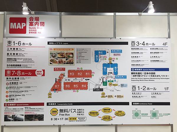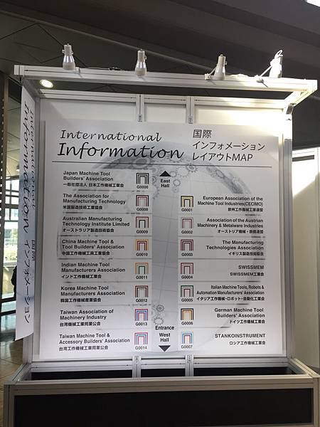 藍色區域就是西館展區,粉色部分是東館展區,東7跟東8是新蓋好的展館。整個展覽的動線跟指示都做得很清楚,所以即便展館很大也不會覺得很亂。我的路線則是從入口進入後往左邊走,也就是往東7館的方向走,會先經過各地公會的攤位,主要宣傳其他各國的工具機展,像是明年的EMO、俄羅斯工具機展、瑞士展等等。