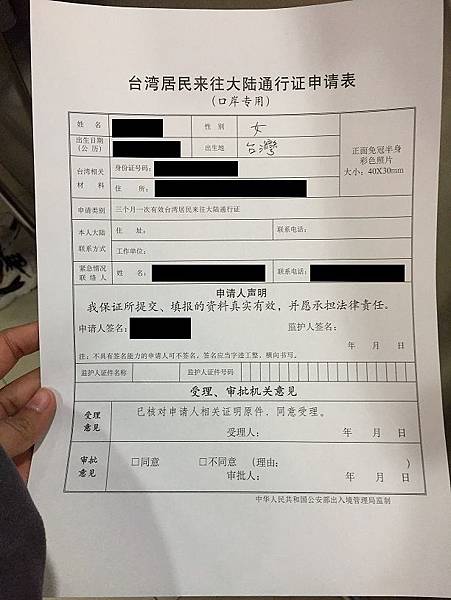 準備 1) 護照 2)身分證 3)兩張2吋大頭貼 4)人民幣50元,一個人辦理時間約10分鐘。