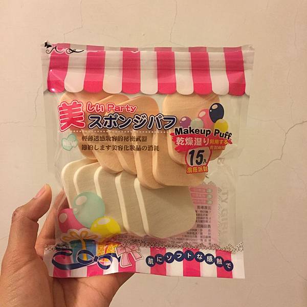 出國前粉撲剛好用完,到寶雅補貨的時候看到這個牌子的粉撲,想說來試試看,因為可以乾濕兩用。為了讓臉保濕,我到上海的時候是把這個沾濕 (像使用美妝蛋一樣)上妝,覺得效果很好,不會吃化妝品,粉撲彈力也不錯,我是一次剛好用完一塊,像這樣15入是台幣59元,也有30入99元,可以試試看。