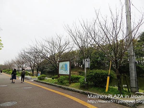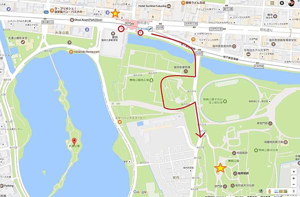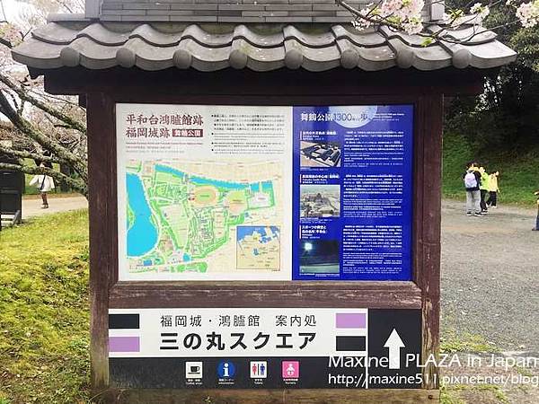 看到舞鶴公園的標誌後繼續往上坡走,舞鶴公園內種植超過一千顆櫻花樹。廣大綠地可以讓民眾野餐,還有歷史悠久的福岡城跡,都是舞鶴公園的重點。