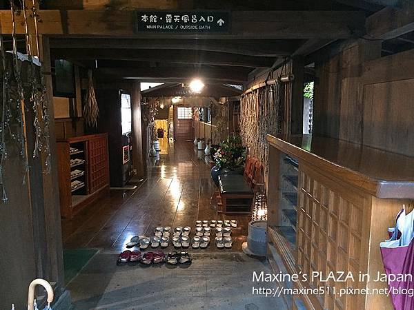 進入本館後,要把室外脫鞋換下,穿上另外一雙室內脫鞋。照片下方紅色藍色的脫鞋,就是旅館提供的室外脫,走去家族風呂也是穿這雙喔!
