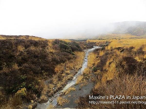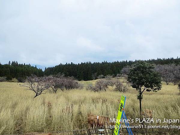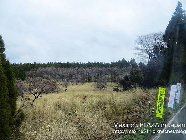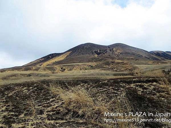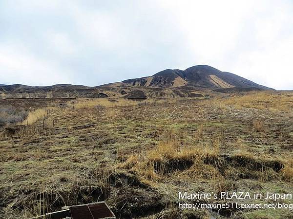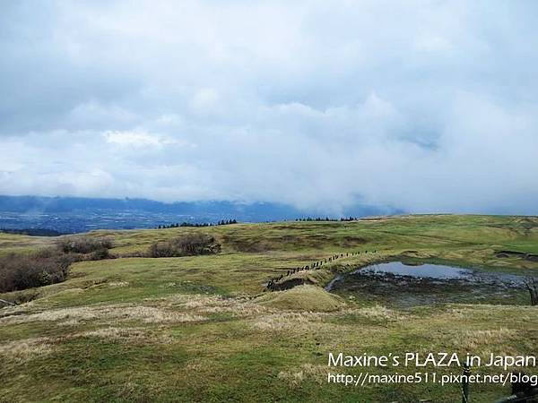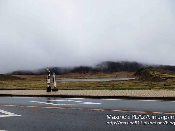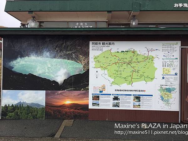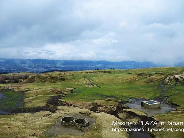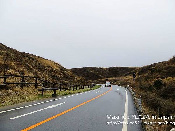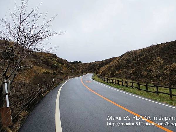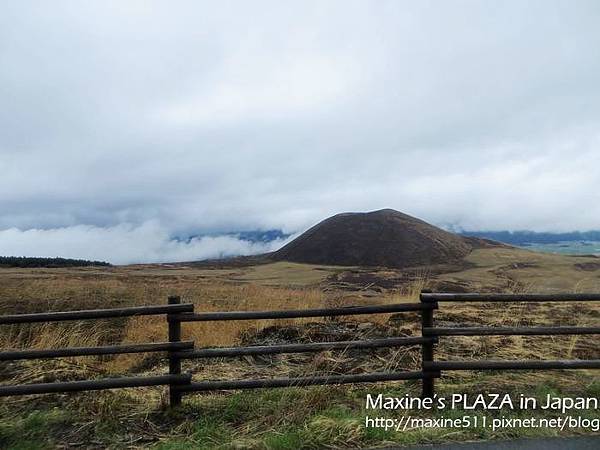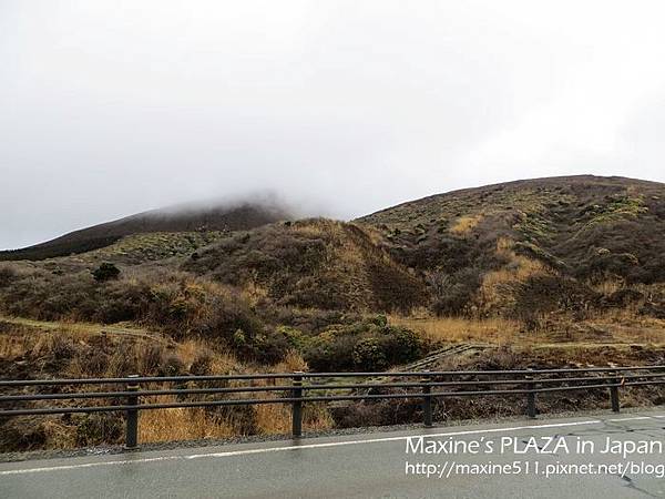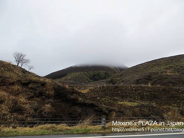 左右兩邊窗外的景色都不一樣,如果想看到阿蘇市區的風景,可以坐右側。行車途中,車上會有語音導覽,日文跟英文介紹。聽了介紹說阿蘇火山其實是火山群的總稱,這裡總共有五座山。