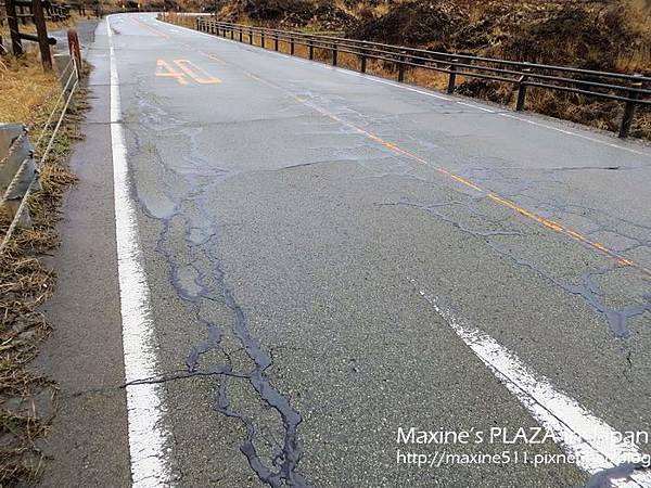 地震後馬路裂開,修復工人用柏油填滿縫隙。