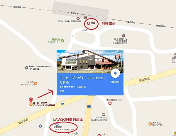 阿蘇車站對面有有LAWSON,如果不想走太遠吃午餐,也可以到這裡買東西吃。逛完便利商店後想說做下來喝個下午茶,就到阿蘇車站隔壁的一間餐廳坐坐。