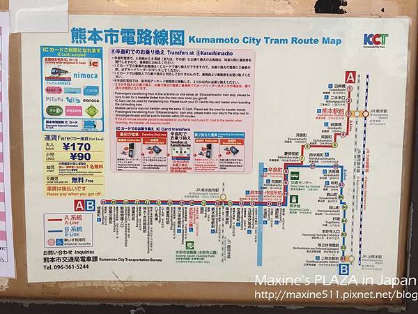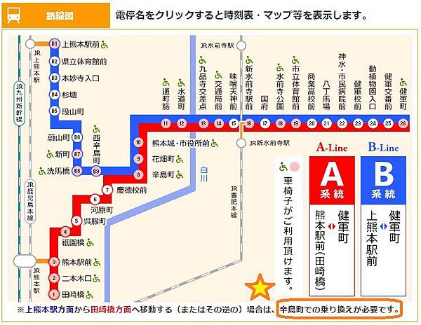 熊本市電總共有兩條線,紅色的A線跟藍色的B線,在第8站「辛島町站」為交匯點。票價部份:大人(中學生以上) 170円,孩童(小學生以下) 90円,如果有幼童 (還未上小學)一位的話免費,單次計費並在下車時收費。統一在前門下車,並在司機旁邊的機器付款或感應。