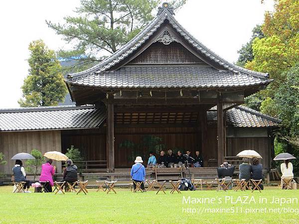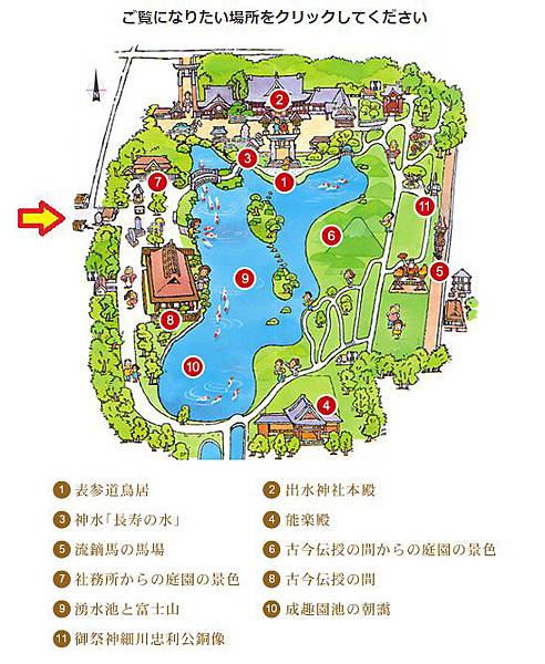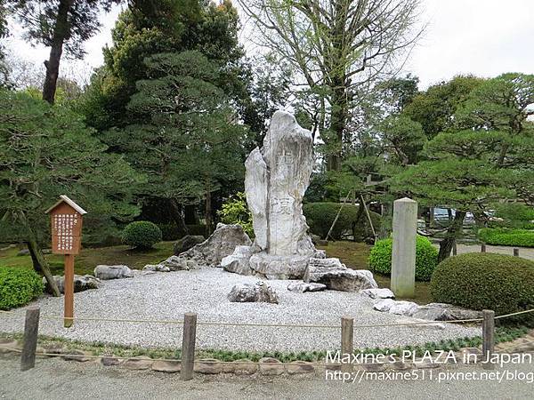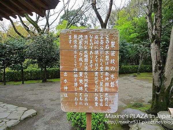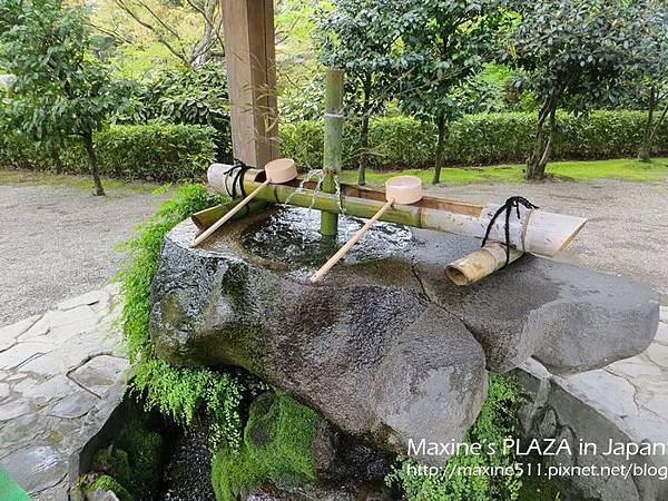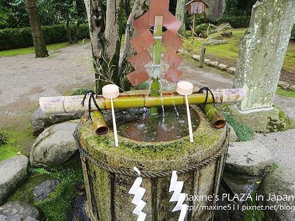 袈裟紋水磐-長壽之水。看介紹水前寺成趣的水池是引進阿蘇山的伏流水,而這個長壽之水的湧泉也是。從以前開始傳言長壽之水除了可以治病,喝了還能長命百歲呢! 喝法:拿勺子舀水將手沖一下後,再把勺子裡的水倒入手中,喝手裡的水。不要直接將勺子對著嘴巴喝唷! 喝完後,將勺子放回竹架上瀝乾 (如上圖)。