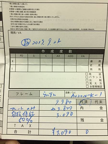 另外只要是外國旅客持有護照購買任何產品都可以享有免稅服務! 我在台灣配眼鏡的費用是2990+1000藍光鏡片=3990元,我懶的問在台灣維修是不是也是可以扣鏡片價格,就當作是2990/2=1500。安撫自己在日本維修比較便宜就對了:)