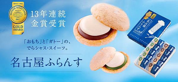 連續13年受到食品金獎肯定,NAGOYA France賣的高級法式和菓子也是被擺在門口之ㄧ的伴手禮商品。藍色包裝是紅豆及抹茶2種口味組盒,蓬鬆的外皮很像麵包店裡面有賣的一種小點心。另外還有推出名古屋限定小倉紅豆口味,跟秋季限定栗子口味。