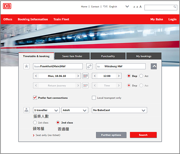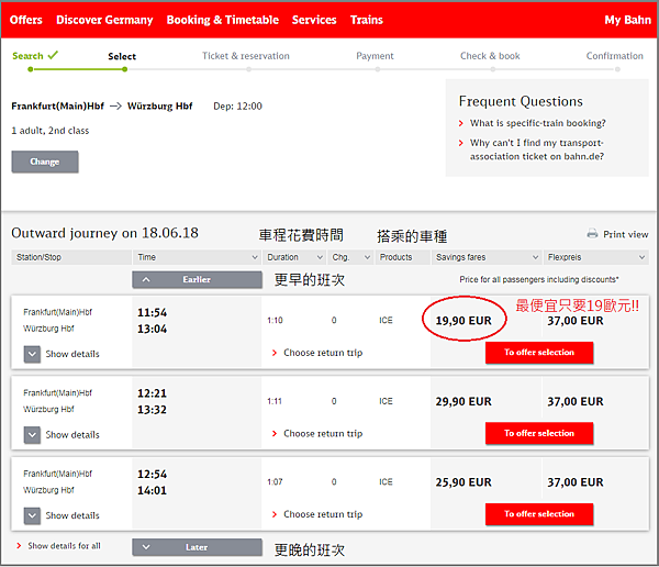 我先示範從法蘭克福中央車站搭車到符茲堡中央車站,日期我拉到6月18號的中午(發文時間四個月後左右)。