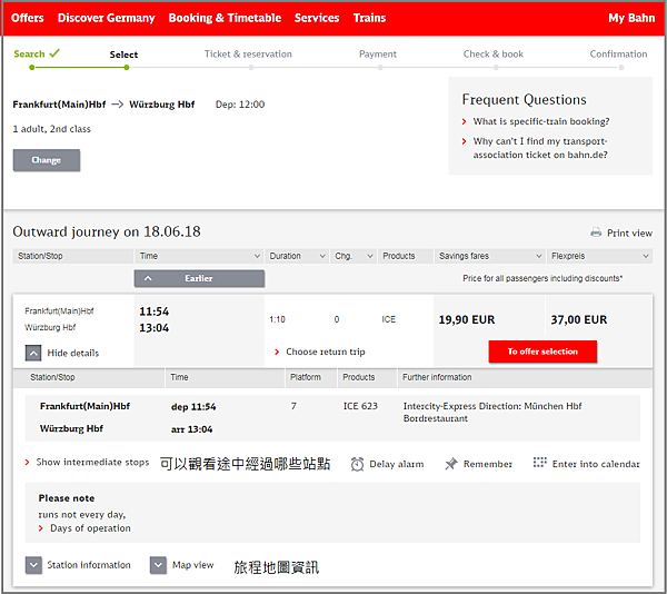 點選 (show details) 的選單後,會出現詳細的ICE車次,到達目的地之前會經過哪些車站,最下面甚至還可以看到旅程地圖的資訊。DB訂票網站提供的資訊是非常完整的,冷靜摸索絕對可以買到車票! 有些路段也有可能需要轉車才能抵達,所以要確認行程細節。