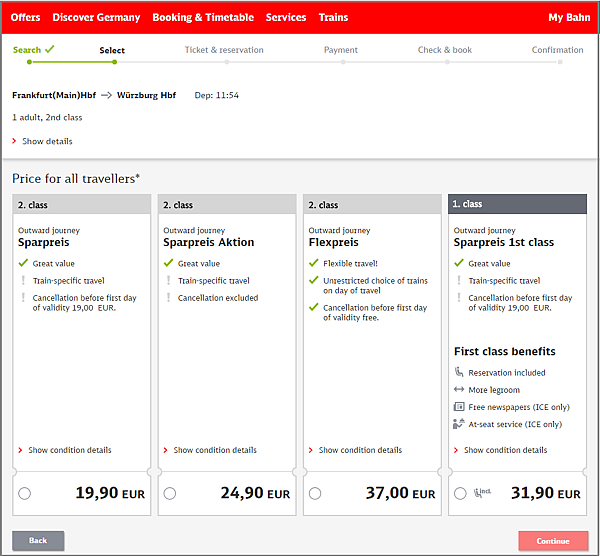 一般來說,為了省交通費一定是會選擇最便宜的車票,但是如果你選擇了Sparpreis 19.90歐元,你不能事後更改搭車日期時間,也不能退票 (退了也沒錢拿),所以如果沒搭上車或取消旅程就必須要重買車票。如果你選Flexpreis 37.00歐元,你可以更改搭車時間,還可以免費退票。