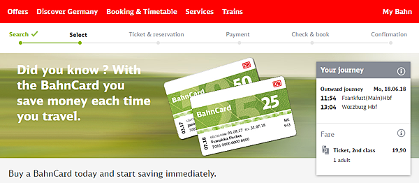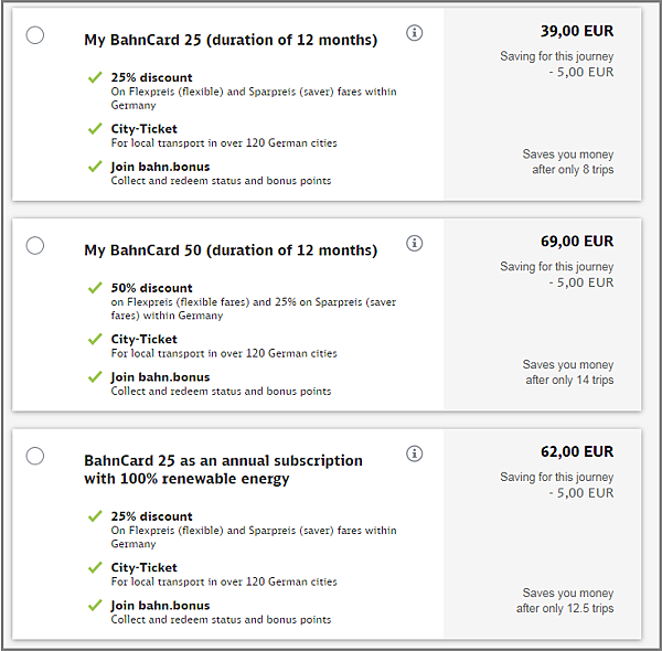 這個「BahnCard」可以幫助你在訂票的時候省下一點錢,系統也會告訴你使用幾次過後你就可以回本,比較適合常跑歐洲而且要靠DB通勤的人使用,就跟雙北推出的1280通勤套票是差不多的道理。