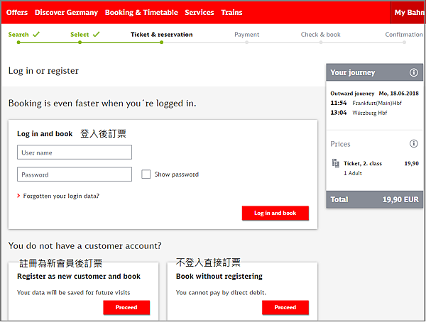 這一個步驟是系統詢問你要不要登入或註冊,如果想要之後方便管理訂票你可以註冊成會員,這樣後續可以使用DB的App。如果嫌麻煩不登入直接訂票也可以,我自己是久久才去一次德國,沒有註冊,車票一張一張慢慢印出來。
