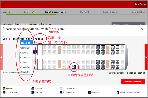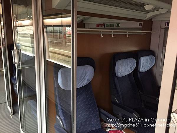 車廂內的行李置物架在車廂中間,我通常都會選在置物架的附近,這樣比較方便顧行李。另外(Coach)下拉後可以看到全部的車廂數,像這一班ICE只有28、29是頭等艙,其它都是普通艙。