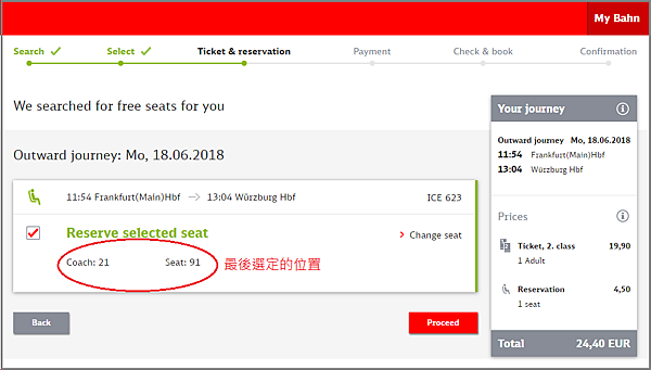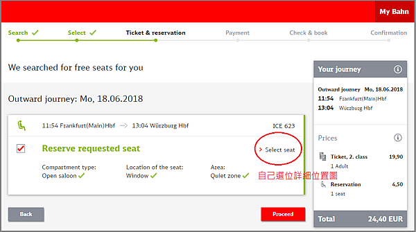 同個頁面的最下方,按下一步之前,選擇要不要訂位。我建議以下兩種情況可以考慮訂位:1. 車程較久的班車 2. 回到有機場的大城市,像是法蘭克福、慕尼黑。