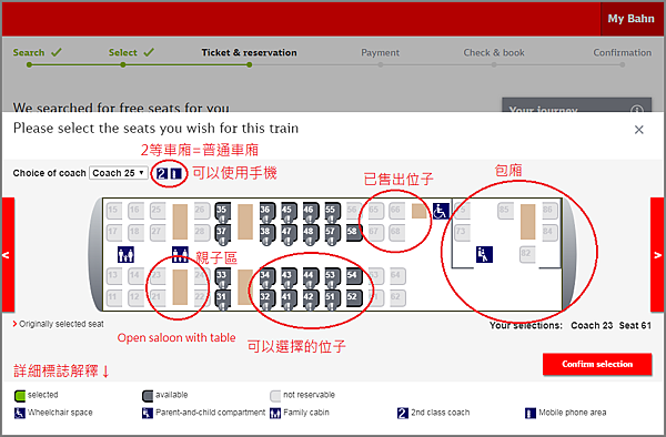 這張第25節位置圖,右手邊的包廂就是上面講到的Compartment位置,車廂旁邊的數字「2」代表車廂等級,數字旁邊則會標示車廂規則 (可用手機、不可用手機)。位置跟位置中間如果有咖啡色的長方形,就是上面講到Open saloon with table(有桌子)的位置。如果位置圖的標誌有看不懂的,也可以直接看最下面的解釋。
