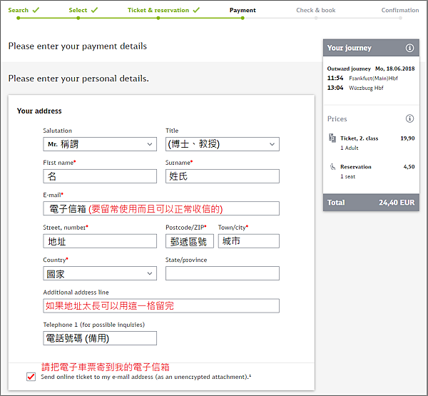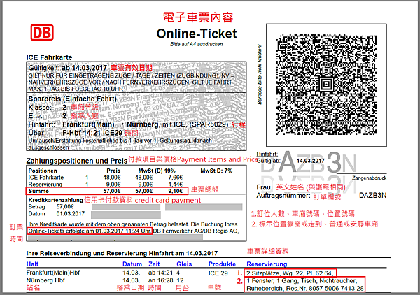 先看右邊QRcode下方,德文的先生是Herr 女士是Frau,訂票人的英文姓名務必要跟護照ㄧ樣,這樣車長在核對國外旅客車票的時候才會正確。每一筆訂單不管人數多少,都只會有一張電子車票。訂好票後去信箱把這張車票印出來,搭車就看這張車票,驗過車票後車長會在車票右邊打洞跟日期,代表車票已驗過。我不知道可不可以用app顯示車票,因為我沒有試過,不過我還是建議可以印車票以備不時之需 (海關有可能會要求看車票)。另外要注意的是車位資訊那邊,Zeit是搭車時間跟抵達時間,Gleis則是上下車月台。
