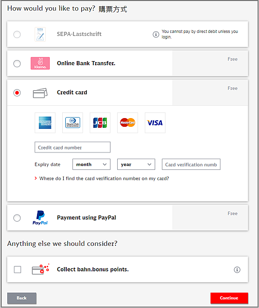 下一頁系統會跟你確認你有沒有一種打折卡叫作「BahnCard」?