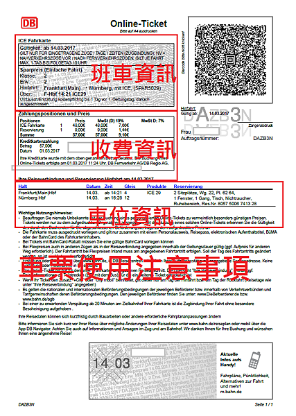 這張是我從法蘭克福中央車站搭車到紐倫堡中央車站的電子車票,車票主要分成三部分:1. 班車資訊 2. 車票價格 3. 車位資訊,然後下面有ㄧ些車票使用注意事項。因為車票都是德文,所以我用中文詳細說明,請看下方圖片。