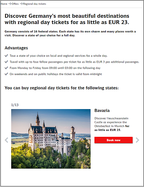 火車通票像我說的建議搭ICE往返城市比較划算(長程),但是也有很多是很local的景點,不需要到太遠的城市去,只需要搭區間火車就可以抵達了,這樣的話買火車通票反而太貴,這個時候就可以參考德國邦票。