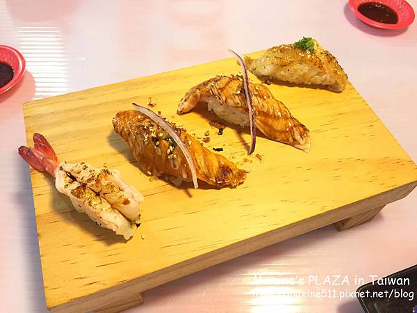 再來是炙燒握壽司,炙燒蝦→兩份炙燒鮭魚肚→炙燒比目魚,一貫50元。另外有點一份海膽軍艦(沒拍到),朋友說海膽味很濃郁但是不會有腥味,含有一點甜甜的。