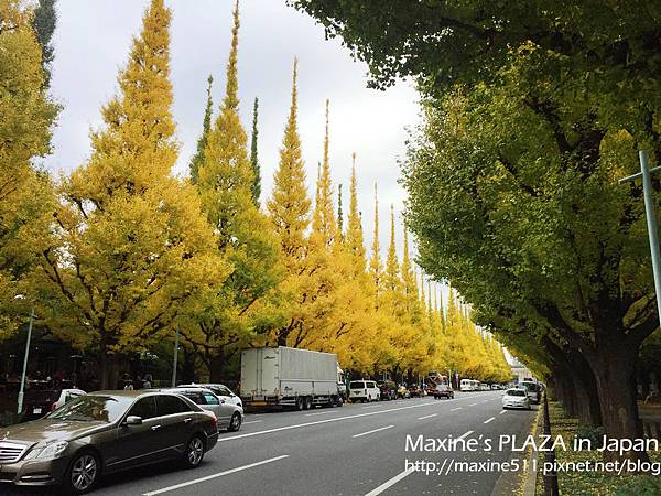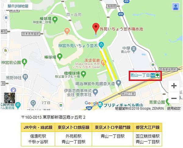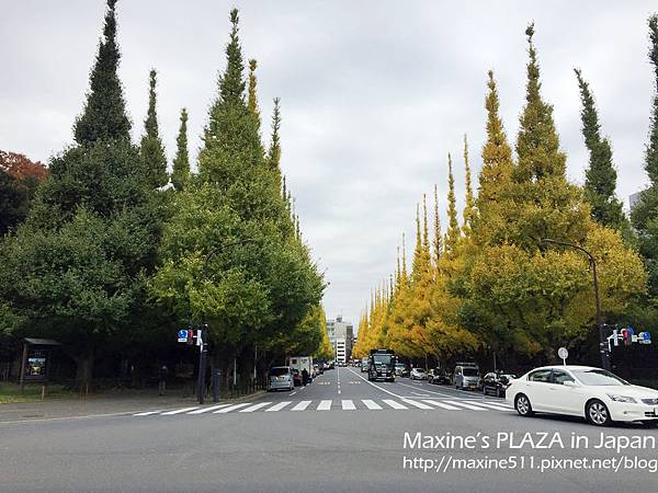 從青山一丁目站出來後,走到地面上,可以直接步行到明治神宮外苑前欣賞銀杏並木(神宮外苑いちょう並木),地圖兩排黃線都是銀杏唷!