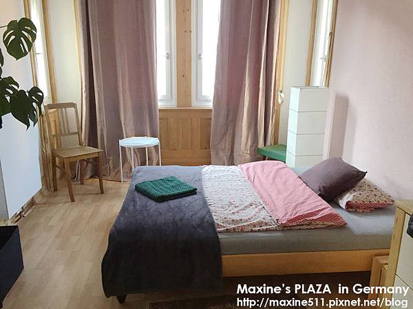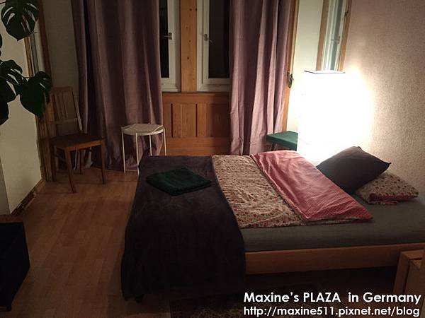 這個是客房,舒適的雙人床跟枕頭,床正對面的白色板子就是暖氣。根據德國的法律,如果房東的房間/房子沒有暖氣是不能租給別人的,所以請大家一定要注意慎選。不要看被子感覺薄薄的一條,其實很夠用了,我晚上也沒有特別穿的很厚,無印的薄長袖踢跟Uniqlo的薄棉褲,晚上還睡到小小出汗。我個人是覺得棉被的材質有保溫(不透風)的效果,所以蓋住全身後就不覺得冷了。