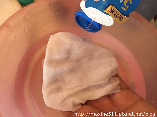 先把美容毛巾沾濕後把水擰乾,再用卸妝水把美容毛巾用濕。先用水沾濕的原因就是可以不用浪費太多卸妝水。