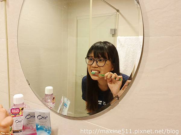 在刷牙之前我會先用牙線清潔齒縫,因為我有一兩顆牙齒間的齒縫比較大,每次都會卡食物,這樣才能清掉卡在齒縫間的東西。之後我習慣先刷門牙再往牙齒兩側刷過去,由前往後刷。使用Ora²牙刷的好處就是因為它的刷頭小,所以可以清楚地刷到較裡面的牙齒,但是也要注意不要因為牙刷小反而加重刷牙的力道,這樣有可能會傷害到牙齦導致牙齦萎縮或牙齦敏感。