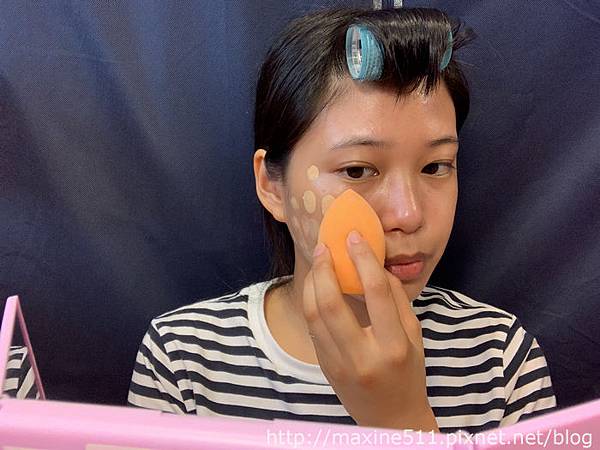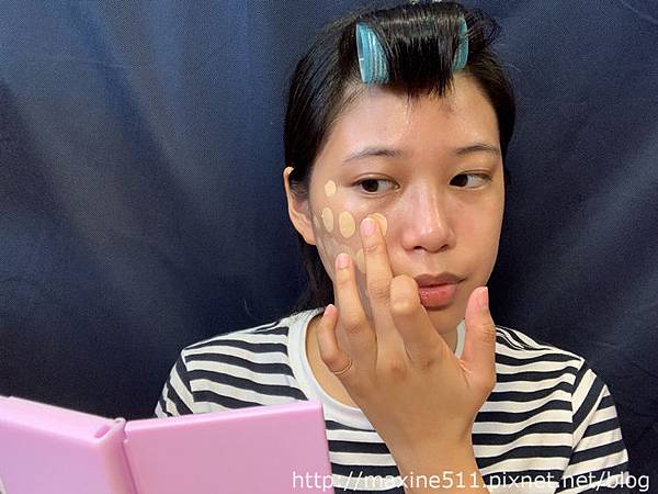 上妝時我會把粉底液擠在手上後,用手指沾取均勻點在臉上,由於這一款粉底液比較容易變乾,所以我會建議小範圍的慢慢上妝,這樣用美妝蛋或刷具推開時才不會卡卡。