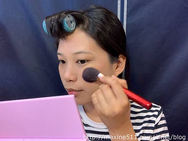 之後在使用蜜粉定妝、上腮紅跟修容。