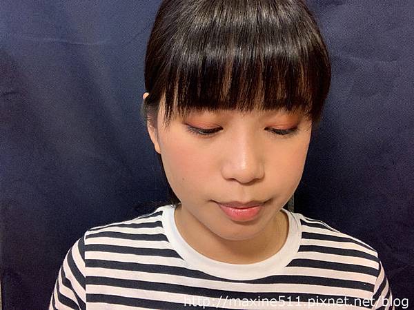 眼影的部分我喜歡先取一個顏色畫滿整個眼窩,再慢慢往深色漸層,最後再用眼影劃一條眼線。第一個顏色使用第三排的南瓜色當底色。