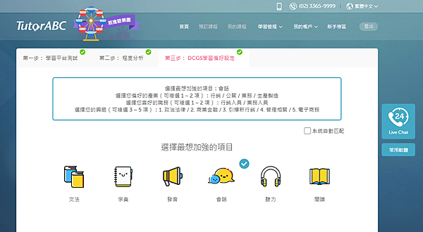 TutorABC的另一個特色就是可以提供學員『個人化』的課程,TutorABC擁有DCGS獨家AI人工智慧與大數據分析,依照程度、個人興趣、性格來量身打造學員專屬課程。