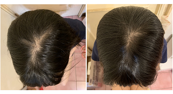由於使用前後拍照時的分線不太一樣所以頭部上半段(後腦勺區域)的髮量差異比較不準,請幫我focus在劉海髮根區域髮量差異。