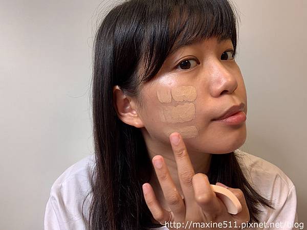 超進化持久粉底液有12種色號,防曬係數SPF35 PA++++。我一樣先將粉撲沾濕後,取適量粉底塗在臉上再慢慢推開。