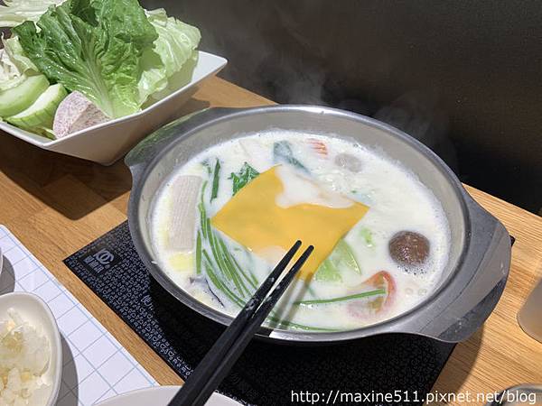 這個是朋友點的起司牛奶鍋,由於我個人不喜歡吃牛奶鍋所以我就沒有試喝了,但是我朋友很喜歡。送上湯底的時候會附一瓶牛奶給客人加,也可以到醬料區那昆布湯底加入牛奶鍋中。