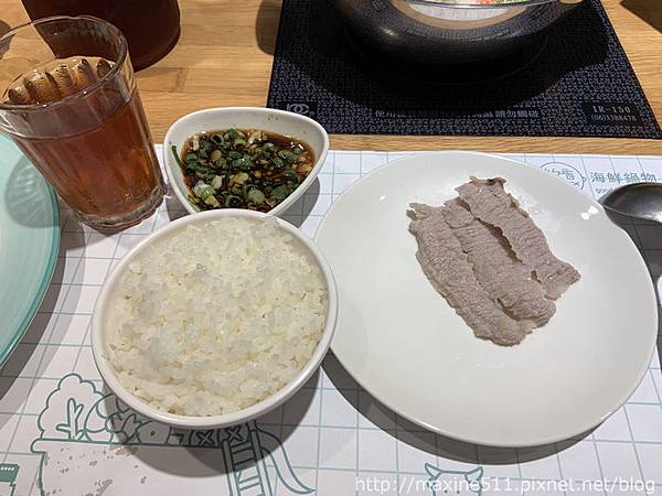 松阪豬肉片加一點醬料再配一口飯,肉片煮完飯也吃完了,吃火鍋果然是要點個松阪豬肉慰勞自己。