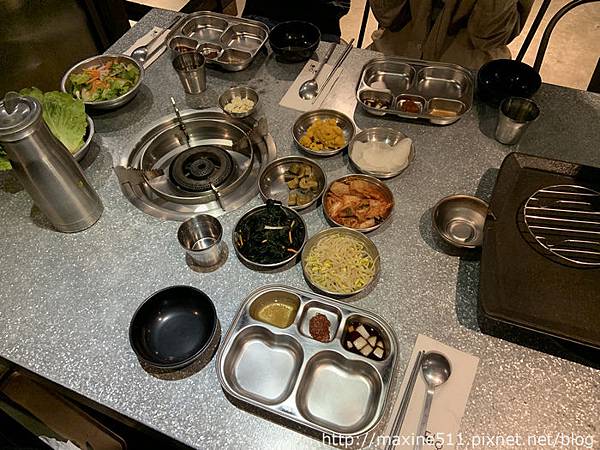 一入座會有六樣小菜、沙拉跟包肉的生菜。小菜跟生菜都可以續加,我超喜歡吃醃蘿蔔一直續加。醬料的部分從左到右是香油海鹽-韓式辣醬-洋蔥醬。