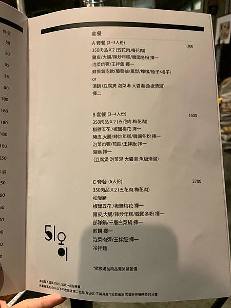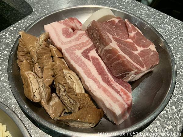 我們三個人用餐點了一份A套餐主餐的部分除了梅花肉跟五花肉,我們選了大腸跟泡菜肉彈 。