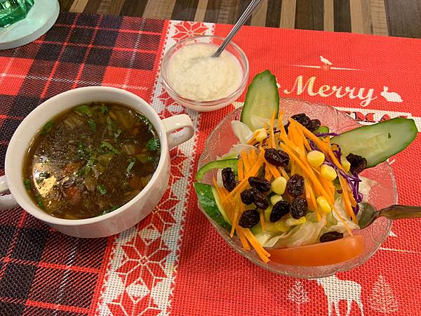 沙拉的料是一般的生菜、小黃瓜、玉米、紅蘿波絲跟我最愛的葡萄乾。沙拉醬的話比較特別,是非常濃郁的洋蔥醬,如果怕吃完嘴巴嗆嗆的話可以沾一點就好,或是配著葡萄乾一起吃也可以中和一點嗆味。