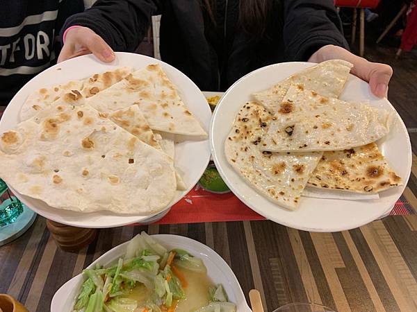 因為知道只吃米飯配咖哩一定吃不完,所以點了兩個口味的烤餅沾咖哩吃。兩個烤餅都不錯,非常扎實,但我私心推薦奶油烤餅。從外觀上可以明顯看出奶油烤餅比較濕潤一些,塗上奶油之後餅皮香氣四溢,單吃也很好吃,沾著咖哩一起入口,會有一種甜甜鹹鹹的口感,反正就是大推兩個字!!