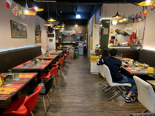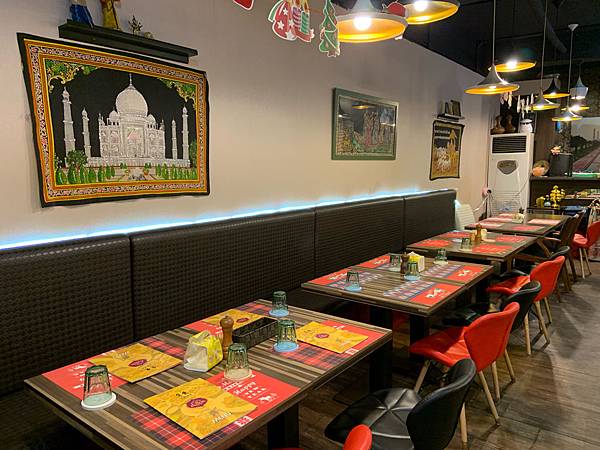 「奪愛印度咖哩」的座位以4人座為主,兩側座位靠牆的用沙發椅,走道則用一般椅子,廚房跟櫃台則在店內尾端。