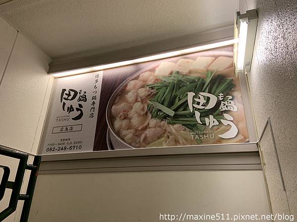 第一天到日本之後,我們直接從岡山車站坐車到廣島,打算從廣島玩回岡山。每次出國第一天拉車行程總會又餓又累,然後晚上又變超冷,我跟妹妹都想吃熱食暖暖身子,但是又不想吃壽喜燒跟拉麵,在廣島本通商店街上的亂走的時候發現了這家 「田しゅうもつ鍋」。