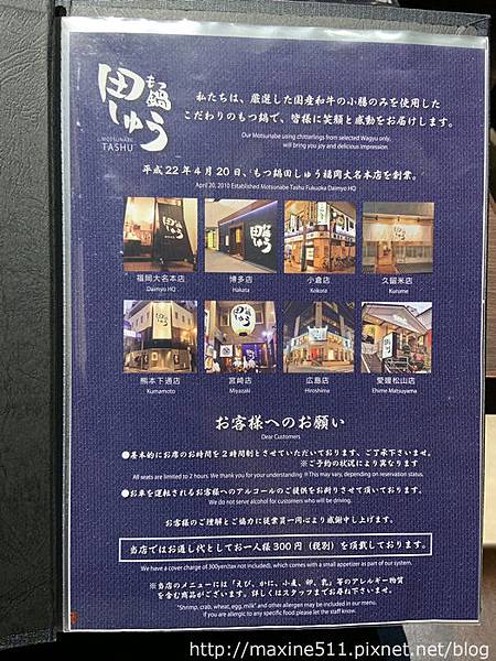 「田しゅうもつ鍋」本店在九州福岡,在日本目前共有10家店:福岡大名本店/博多店/久留米店/熊本下通店/ 広島店/小倉店/宮崎店/愛媛松山店/名古屋店/鹿児島店。