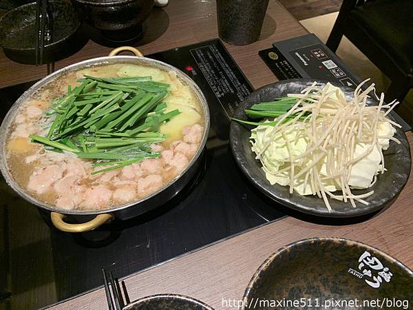 等了一會兒,我們的もつ鍋終於上桌拉~鍋子裡面已經先放入一部分的青菜 (韭菜、高麗菜、豆芽菜、豆腐、辣椒)跟牛肥腸,可以等湯滾一點在開動。